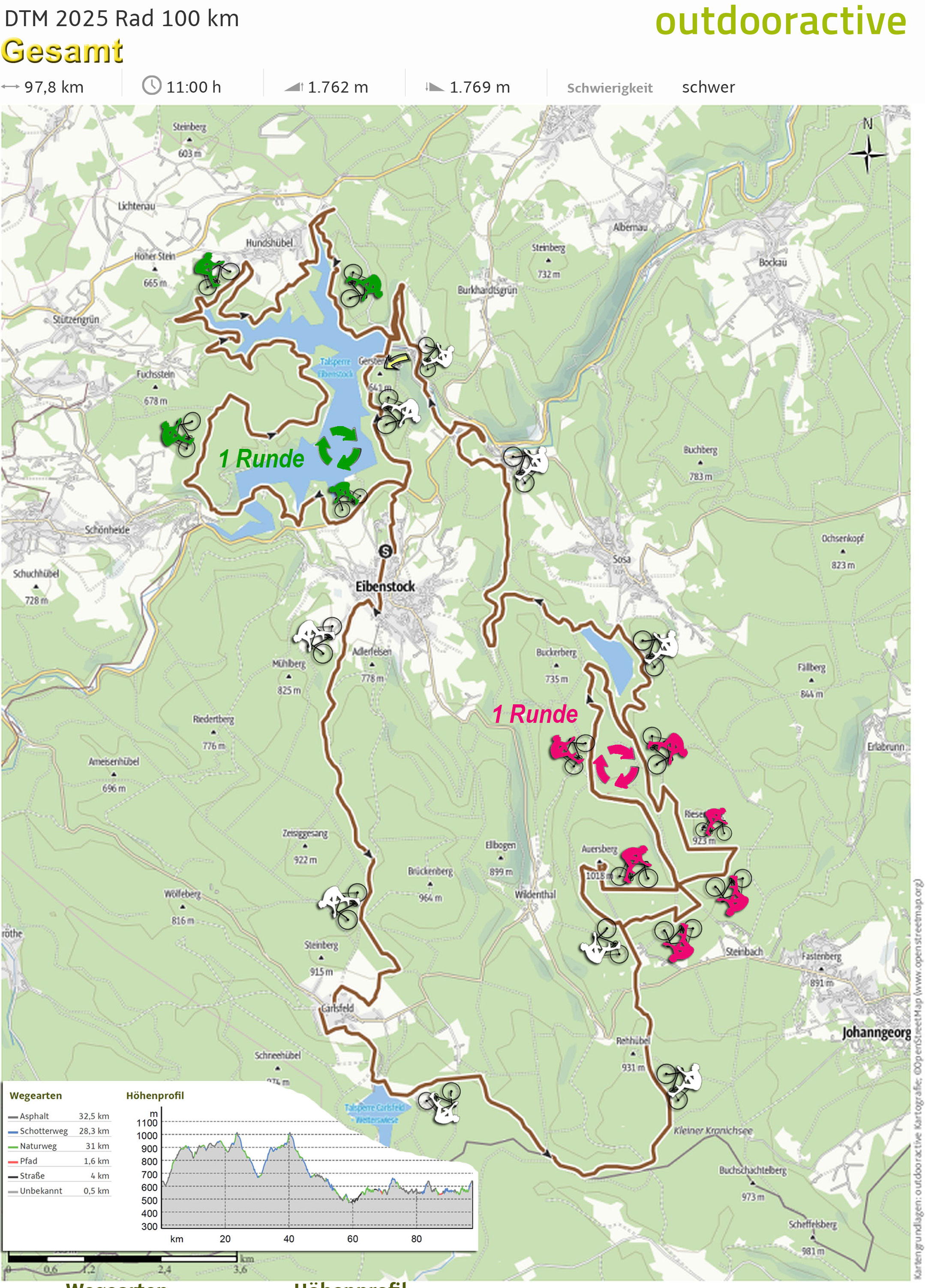 Die Strecke, die ZWEIMAL durchfahren wird, ist wieder in der zum Download bereitgestellten Karte durch Räder symbolisiert.
